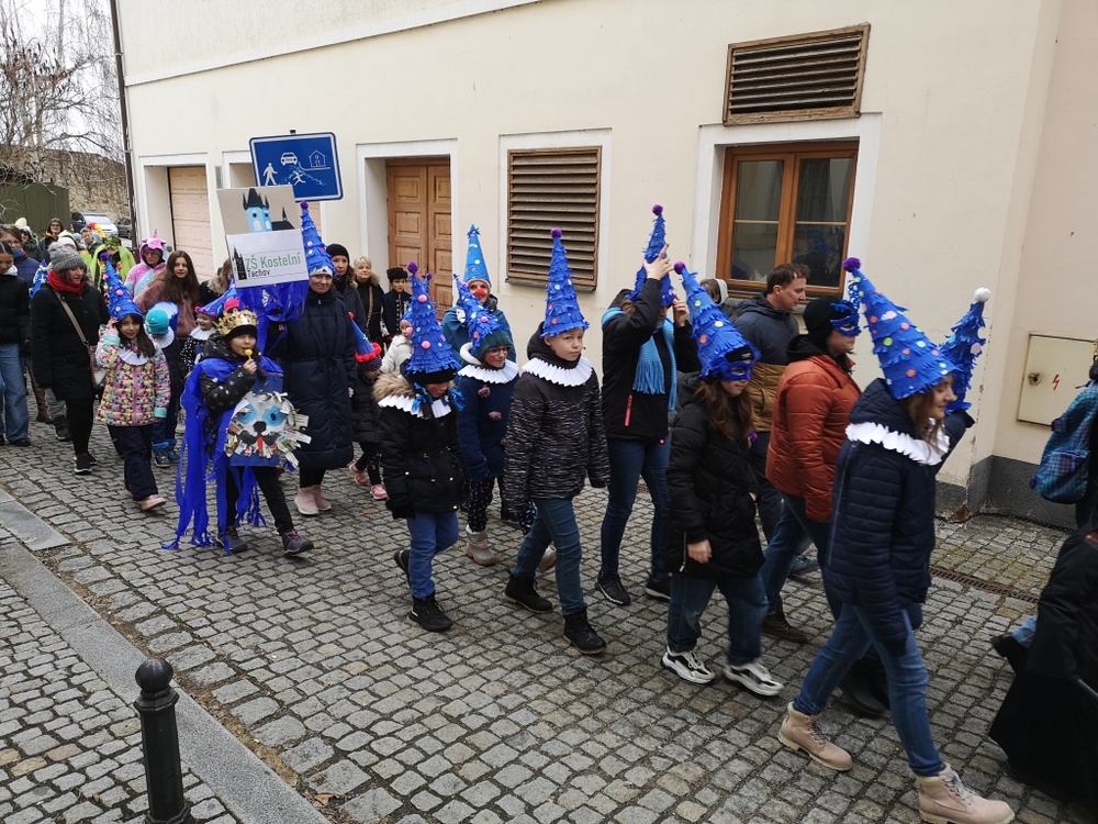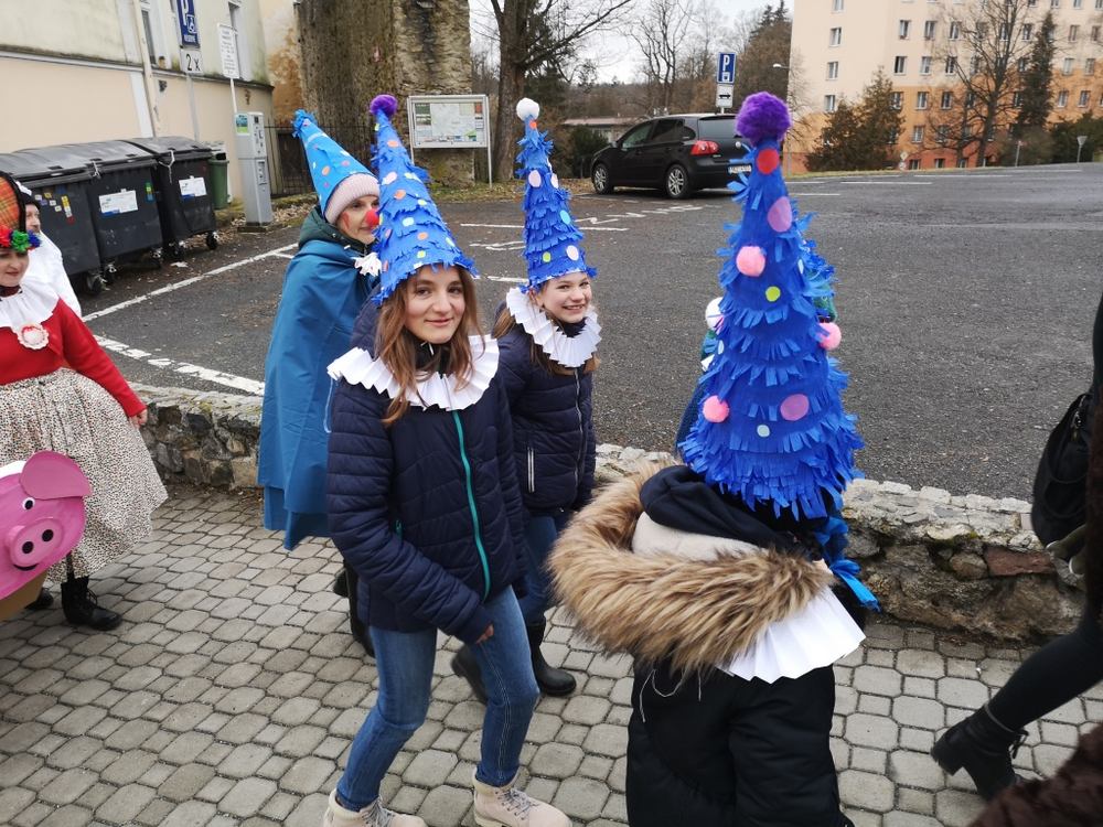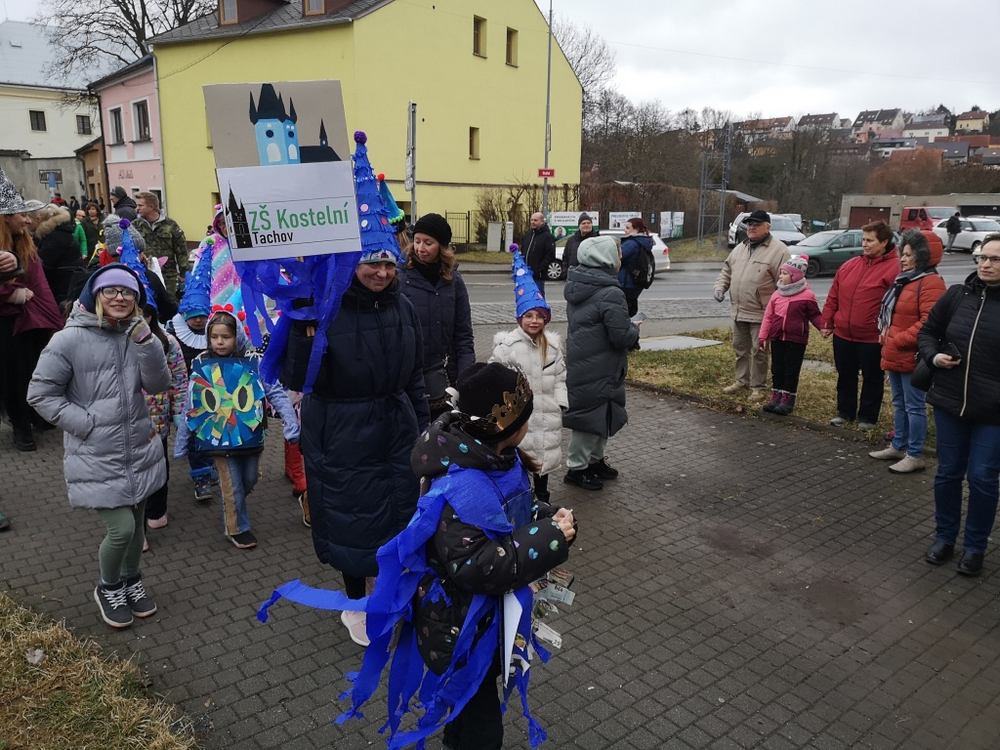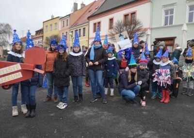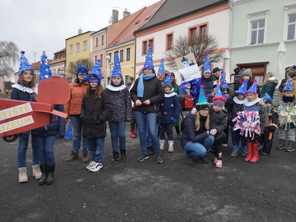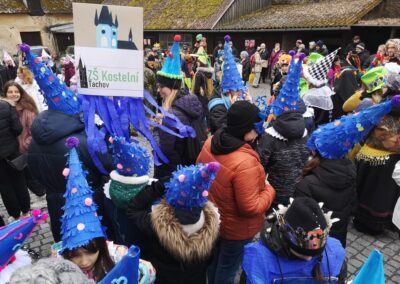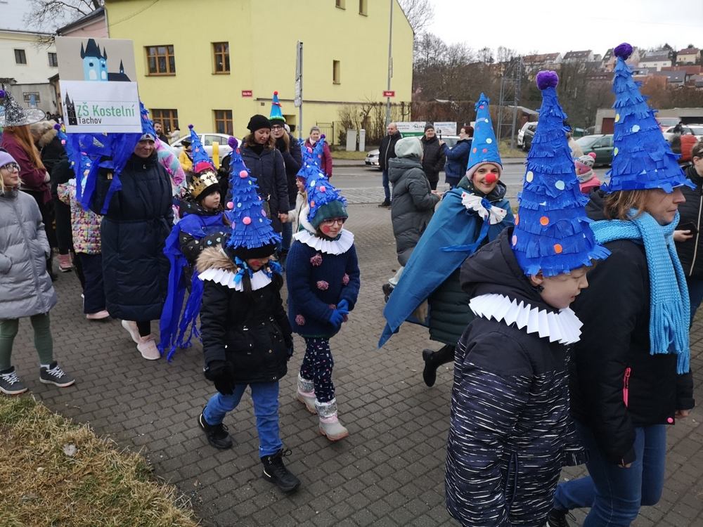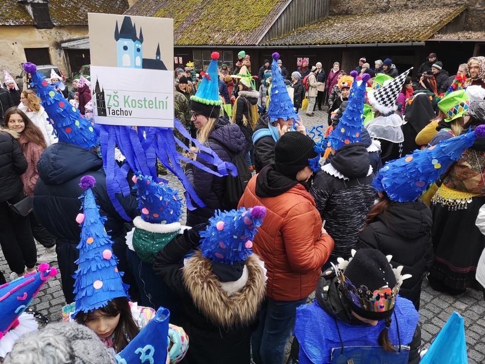 V souvislosti s projektem „Tachovské děti v barvách masopustu“ se hrdě zůčastnila i naše škola ve vybrané tmavě modré barvě. S celým průvodem jsme prošli centrum města, od muzea k náměstí a přes Husitskou až na zámek.