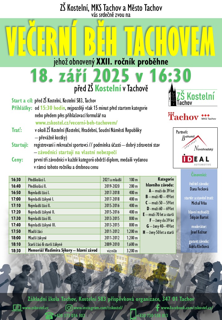 Ve čtvrtek 15. září 2022 proběhl za spolupráce s DDM Mraveniště Tachov, oddílem atletiky Slavoje Tachov a MKS Tachov 1. ročník akce PODvečerní běh s KOSTELKOU. Běžecký závod pro předškolní a školní mládež měl start i cíl v ulici Krvavá, běhalo se v místě mezi parkem...